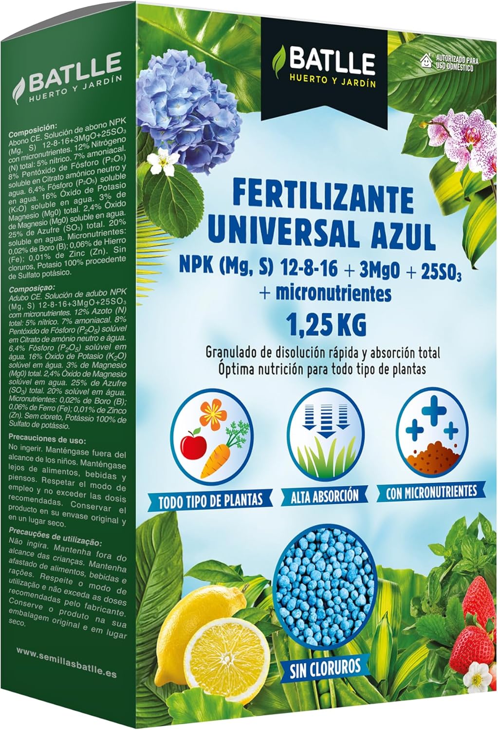 Fertilizante Universal Azul BATLLE es un abono granulado completo que contiene todos los nutrientes esenciales en cada grano, diseñado para plantas de exterior, hortícolas, árboles frutales, arbustos y ornamentales. Su composición exenta de cloruros y rica en micronutrientes, junto con su alta solubilidad, asegura una nutrición equilibrada y un desarrollo óptimo.