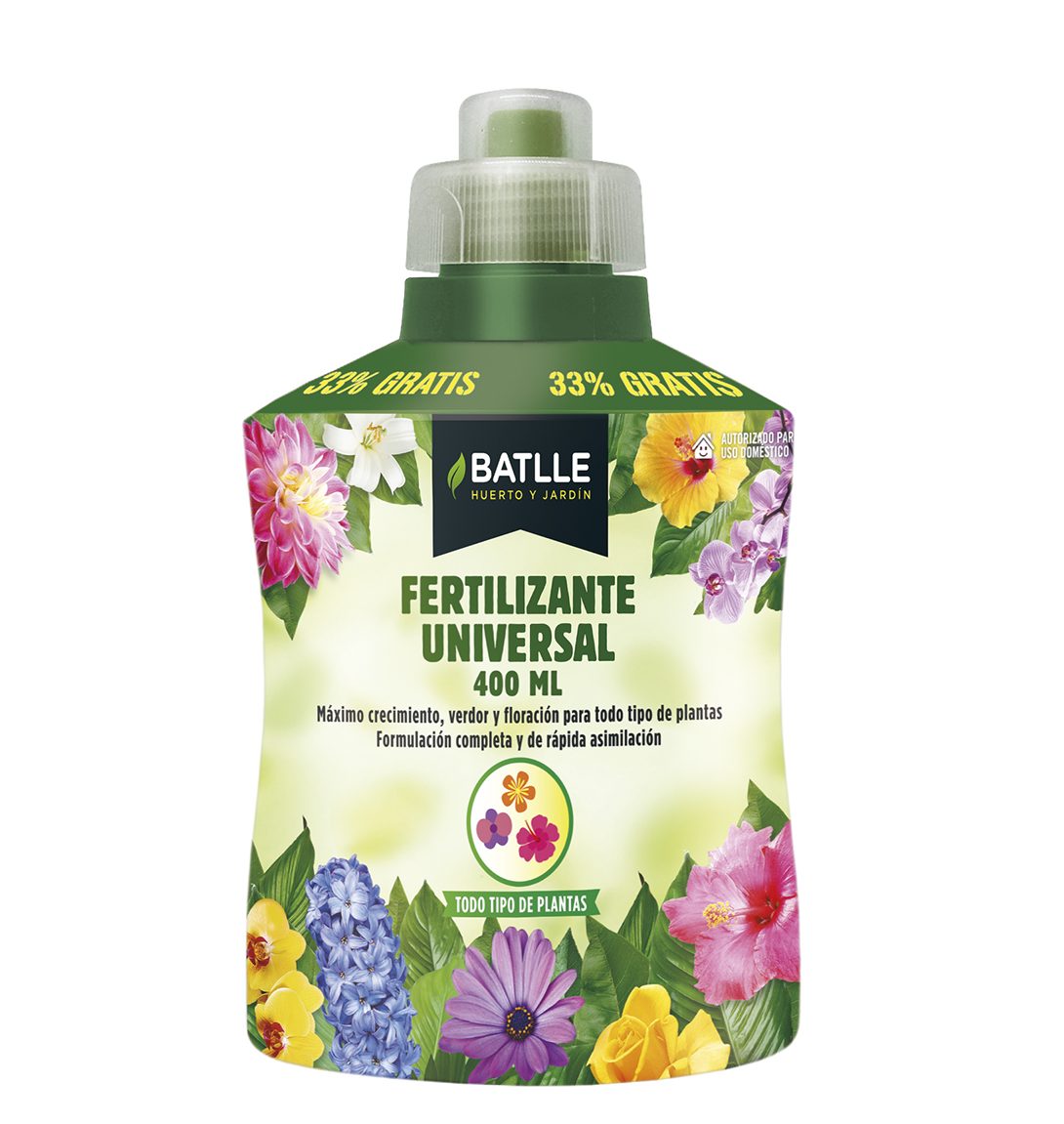 Fertilizante Universal Líquido BATLLE es un complejo nutritivo de rápida absorción, especialmente formulado para aportar los nutrientes esenciales que permiten un crecimiento equilibrado, desarrollo óptimo y floración abundante de cualquier tipo de planta, ya sea de interior, terraza o jardín.