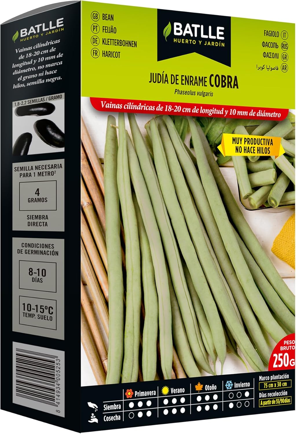 La Judia de Enrame Cobra es una variedad muy apreciada por la excelente calidad de sus vainas y su alto rendimiento. Produce vainas cilíndricas, rectas y uniformes, de 18 a 20 cm de longitud y 7–9 mm de diámetro, totalmente sin hilos y sin marcar el grano, lo que garantiza una textura tierna y un sabor suave.